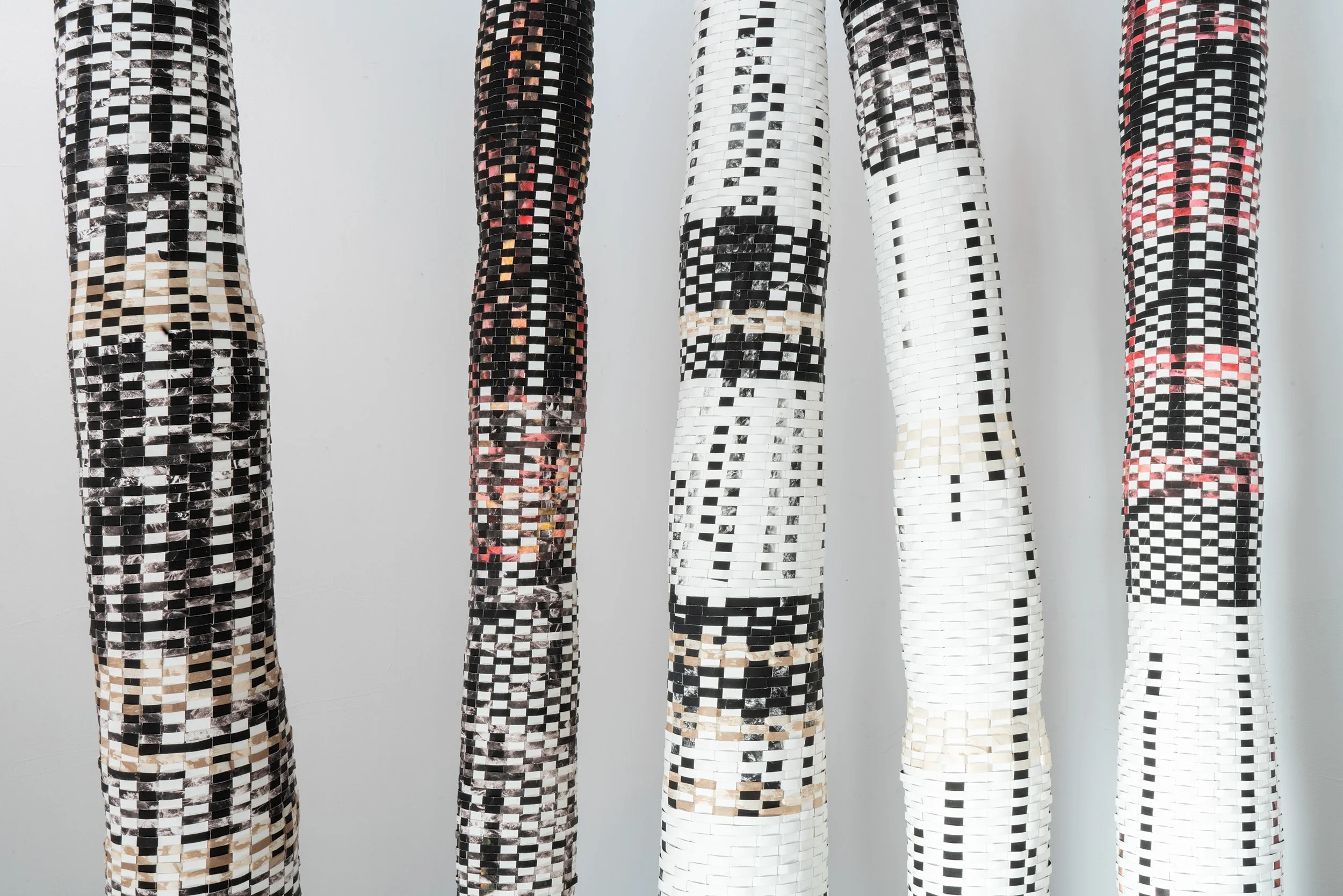 DETAIL, Vertical vessels woven from draft prints in artist's studio, 2025 Sizes range from 6"-10" diameter to 75"-87" tall