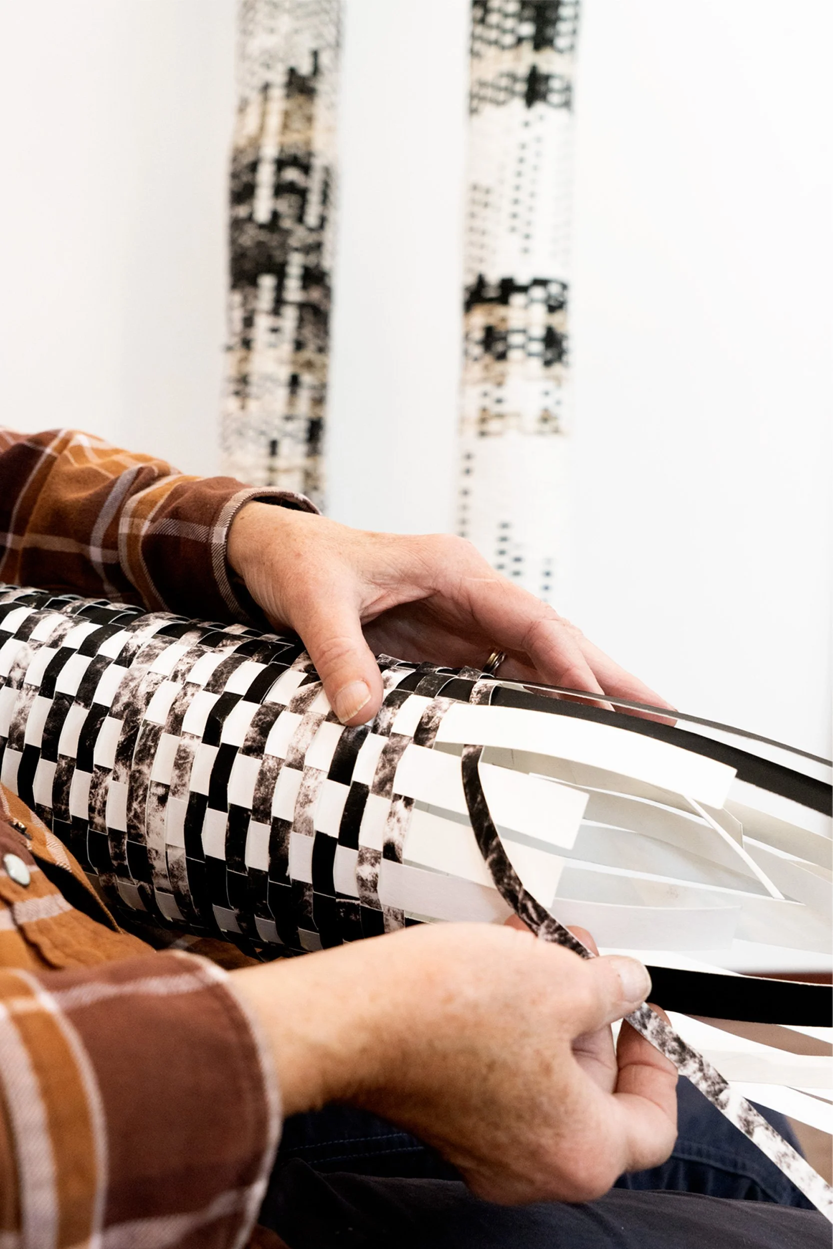 Artist weaving strips of prints into sculptural vessels in her studio, 2025