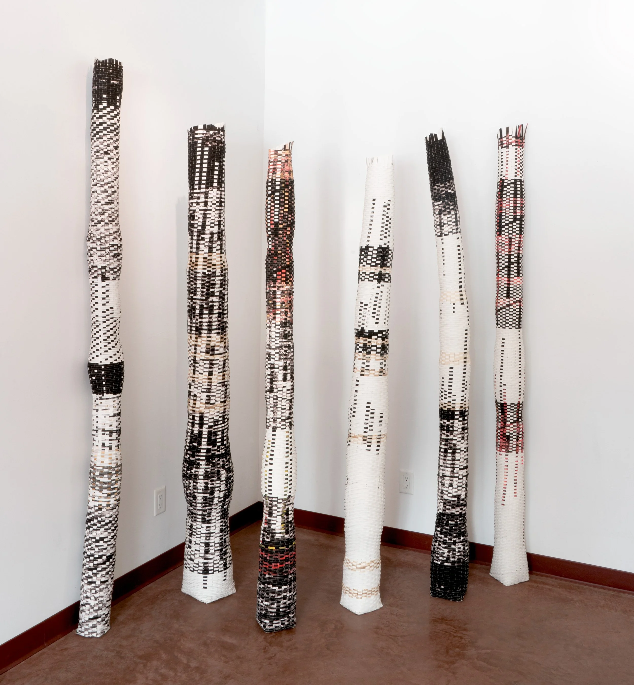 Vertical vessels woven from draft prints in artist's studio, 2025 Sizes range from 6"-10" diameter to 75"-87" tall.